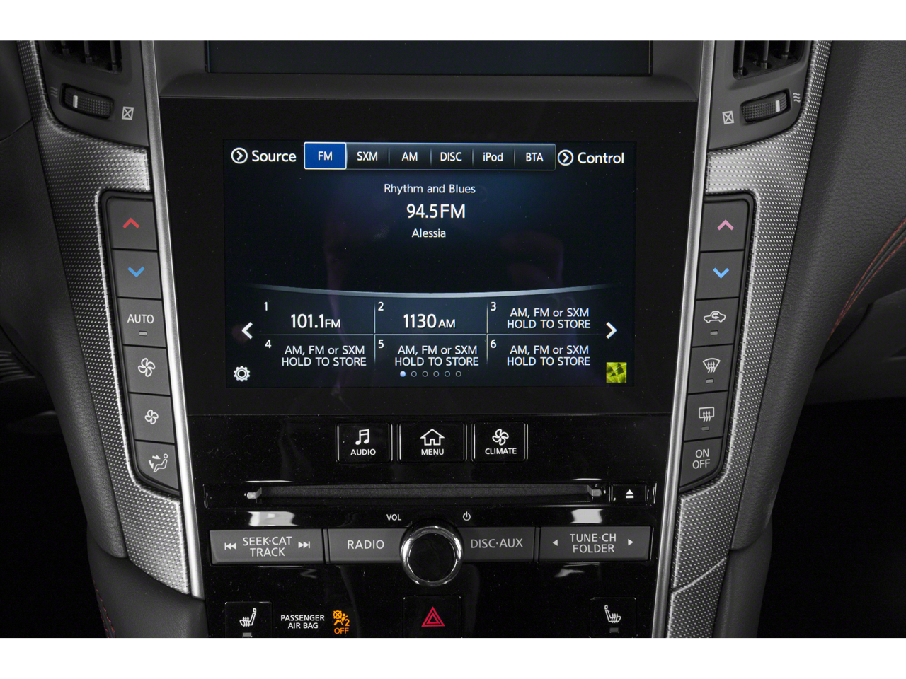 - Radio: AM/FM/CD w/MP3 Playback Capability -inc: HD radio, 6-speaker audio system, Radio Data System (RDS), speed-sensitive volume control, 2 USB connection ports play music for iPod interface, flash drive or other compatible devices, INFINITI InTouch dual display system w/LCD/VGA 8" upper and 7" lower color vehicle-information display and voice recognition for audio and vehicle information systems, INFINITI InTuition customizable environment for audio, SiriusXM satellite radio w/3-month trial subscription, SiriusXM Travel Link w/4-year complimentary trial subscription, steering wheel-mounted audio controls, dual in-glass diversity antennas and Bluetooth® hands-free phone system and streaming audio